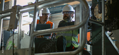 Two professional heavy industry technicians in safety uniforms and hard hats work with equipment at manufacturing factory. Mature supervisor or engineer uses laptop and talks to workers. Slow motion.