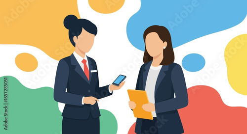 Two professional women in business attire collaborate, one holding a smartphone, the other a document, symbolizing modern communication and teamwork.