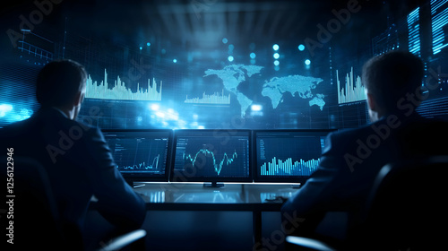 Two professionals analyze data on multiple screens, showcasing a high-tech business environment and advanced analytics.