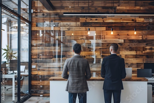 Two Professionals in a Modern Office Setting with a Rustic Wooden Wall
