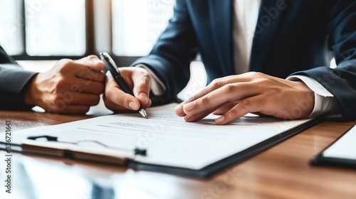 Two professionals in suits reviewing and signing a document at a desk, emphasizing contract agreement and business collaboration.