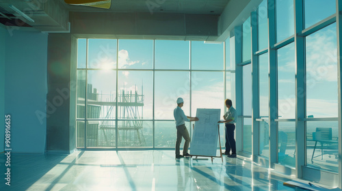 Two professionals review architectural plans in a spacious, sun-drenched office with floor-to-ceiling windows and a panoramic city view.