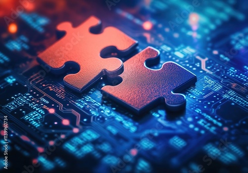Two puzzle pieces fitting together on top of an abstract circuit board,