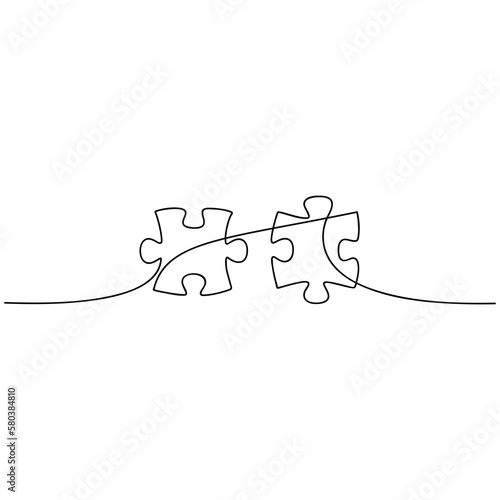 Two puzzle pieces icon one line continuous drawing. Vector illustration. Simple hand drawn linear silhouette. Abstract outline design element for print, banner, card, brochure, minimal logo.