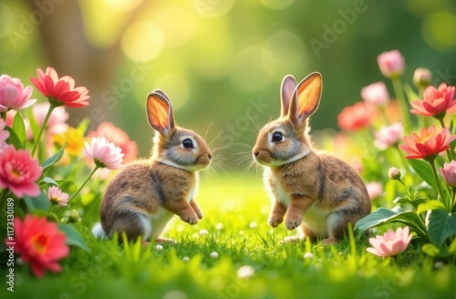 Two rabbits are playfully sniffing each other in a lovely field of flowers