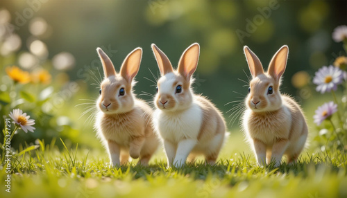 two rabbits in the grass, Two Rabbits Sitting on a Flower Path