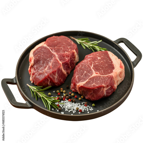 Two raw ribeye steaks with rosemary and peppercorns on a cast iron pan isolated on transparent background