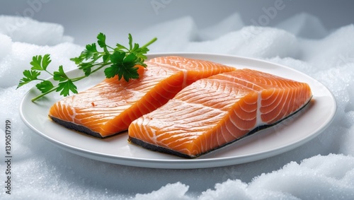 Two raw salmon fillets on a plate garnished with parsley, isolated against a white background.