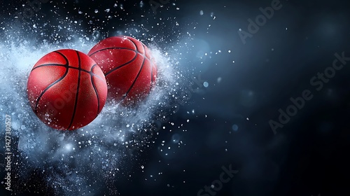 Two red basketballs suspended in a cloud of icy dust against a dark background