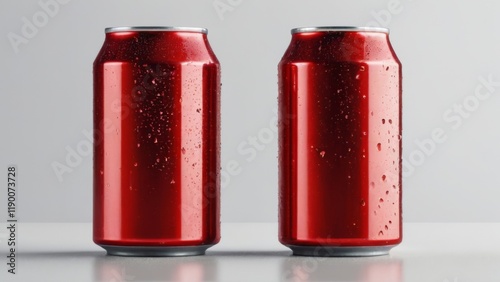 Two red soda cans with water droplets on white surface, shiny metallic finish, clean and minimalistic vibe.