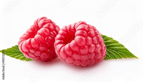 two ripe raspberries with a leaf isolated on a white background