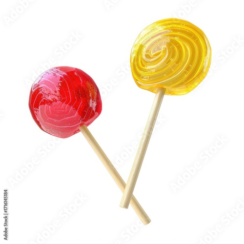 Two round lollipops, one red and one yellow, on wooden sticks, against a white background. The candies have a swirled design