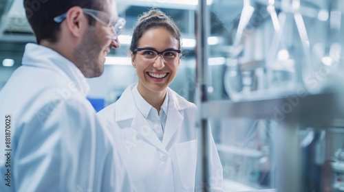 Two scientists smiling and discussing in a laboratory.