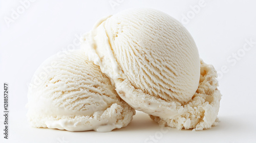 Two scoops of creamy vanilla ice cream are stacked against a pure white background, exhibiting smooth textures and inviting curves.