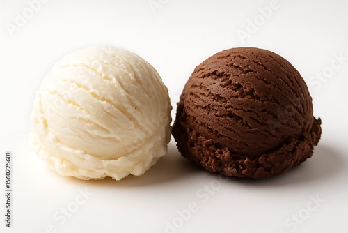 Two scoops of ice cream, one vanilla and one chocolate, isolated on white background