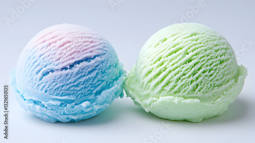 Two scoops of pastel ice cream one light blue and one light green sit side by side