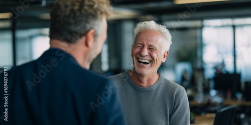 Two senior businessmen talking and laughing in a modern office setting, expressing joy and camaraderie. Concept for team building, successful partnership and corporate culture