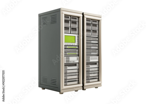 Two server racks on a transparent background. Concept of data storage, networking, and IT infrastructure.