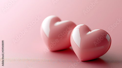 Two shiny light pink heart shapes rest on a soft pink surface casting gentle reflections in a simple romantic arrangement.