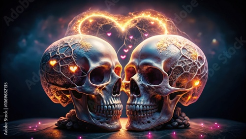 Two Skulls Facing Each Other with a Flaming Heart Above Them