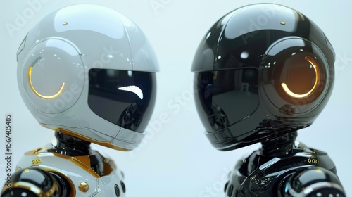 Two sleek futuristic robots, one black and one white, facing each other with glowing eyes and reflective surfaces.