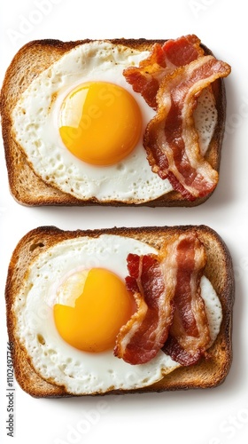 Two slices of golden toast hold sunny-side-up eggs and crispy bacon, presented beautifully on a white plate for a satisfying breakfast