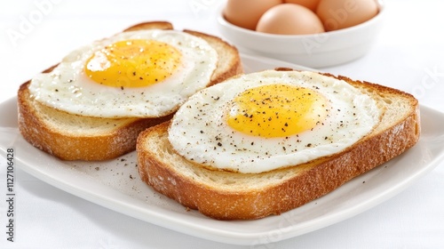 Two slices of toasted bread topped with sunny side up eggs and chopped green onions are served on a neutral plate, with a bowl of eggs visible in the background
