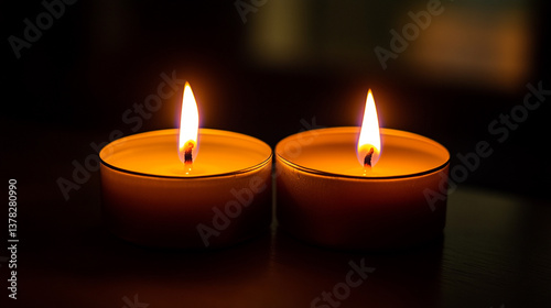 Two small candles with bright flames illuminating a dark space creating a warm and peaceful atmosphere
