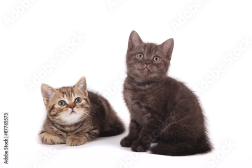 Two small tabby kitten and chocolate kitten on white background. Cats sitting.