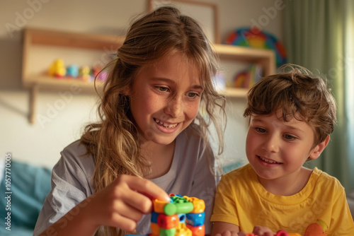 Two smiling children engage in creative play, building with colorful blocks in a cozy, light-filled room. Their joy and teamwork highlight the warmth of sibling bonds and imaginative play.