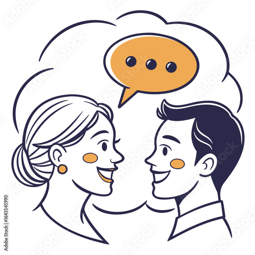 Two smiling people in profile view engaged in conversation with a speech bubble indicating communication and shared ideas in a simple line art style
