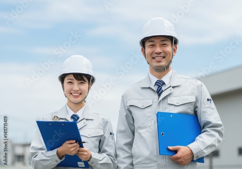 Two smiling workers in hard hats and uniforms holding clipboards against a cloudy sky outside near building