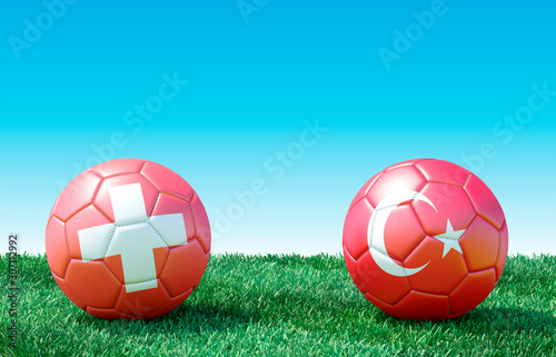 Two soccer balls in flags colors on green grass. Switzerland and Turkey. 3d image
