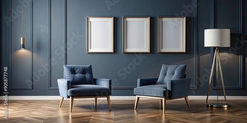 Two square frames on a navy wall with a gray velvet armchair and modern floor lamp in a living room interior, navy