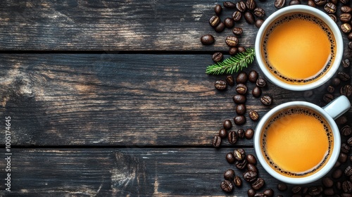 Two Steaming Cups of Espresso on Rustic Wooden Table with Coffee Beans - Perfect Morning Beverage and Cafe Menu Background