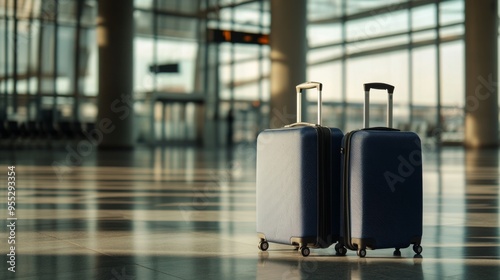 Two stylish suitcases standing in empty airport hall, unrecognizable traveller's luggage waiting in terminal, creative banner for air travels or vacation trip, panorama with copy space