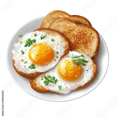 Two sunny side up eggs on toasted bread with parsley, providing a delicious and nutritious breakfast option.