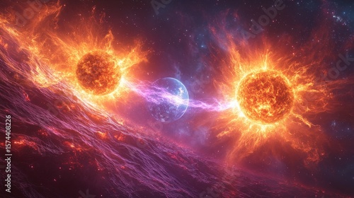 Two suns in fiery embrace, pull the planet in between, engulfed by nebulae and cosmic rays
