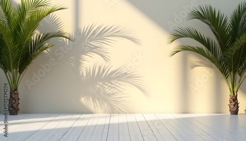 Two tall palm trees casting shadows on a light-colored wall and a wooden floor