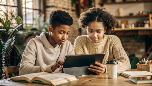 Two teenage students sitting at a desk, collaborating on a school project with a tablet and books.