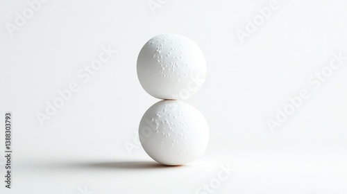 Two textured white spheres are stacked on a white background. The image is simple with a minimalist composition. The high-resolution photo features soft, even lighting. The style is clean and modern.