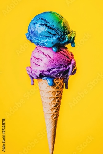 Two vibrant ice cream scoops on a waffle cone, dripping with colorful melted ice cream against a bold yellow background