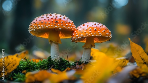 Two vibrant mushrooms with bright orange caps and white spots stand out in a mossy autumnal forest setting