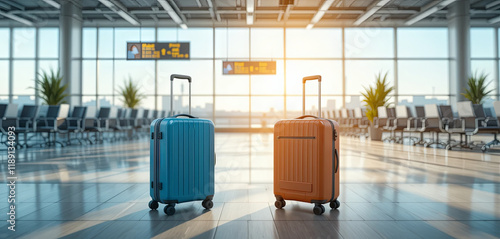 Two vibrant suitcases stand on the polished floor of a busy airport terminal as golden sunlight streams through large windows, creating a travel-ready atmosphere