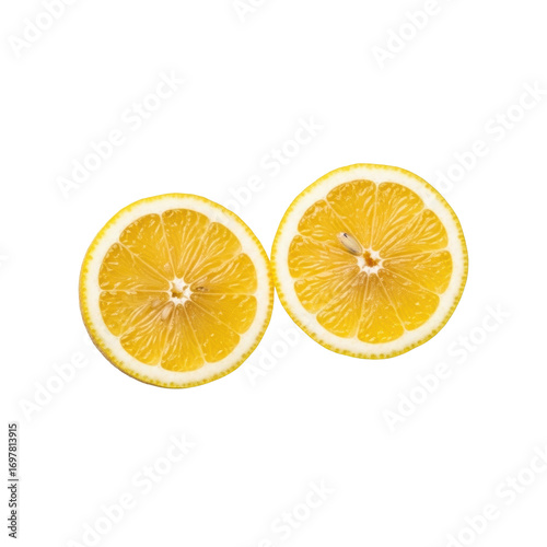 Two vibrant yellow lemon halves with juicy glistening segments and water droplets on a white plate, against a soft gray background, studio macro shot, concept of fresh citrus advertising