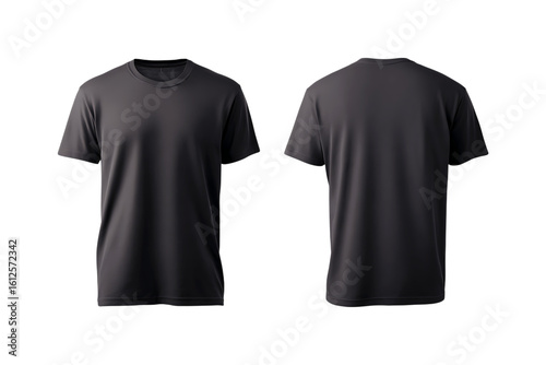 Two views of a plain dark gray short sleeve t shirt shown from the front and back isolated on transparent background
