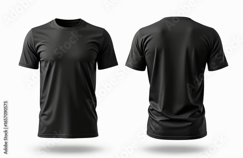 Two views of black t-shirt, front, back. Versatile garment offers minimalist design suitable for various styles, from casual to athletic wear. Smooth, lightweight fabric ensures comfort, sleek
