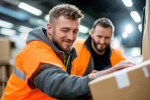 Two warehouse workers efficiently sorting packages in a busy distribution center during daylight hours