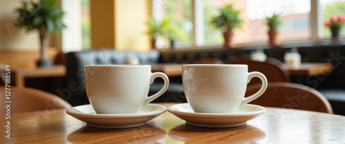 Two white coffee cups on saucers positioned on a wooden table, creating a cozy and inviting atmosphere for connection and conversation in a cafe setting with greenery in the background