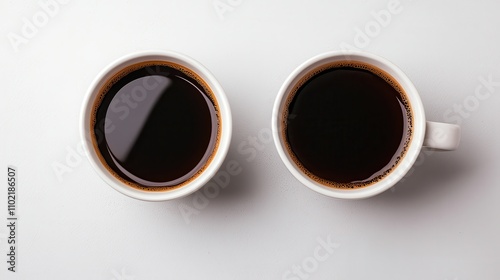 Two white cups filled with dark coffee are placed side by side on a light surface, creating a minimalist and inviting coffee scene.